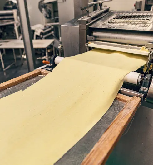 日本の製麺と同じように、商品毎に、加水率や原材料の配合比を変更し、生地つくりを行います。
